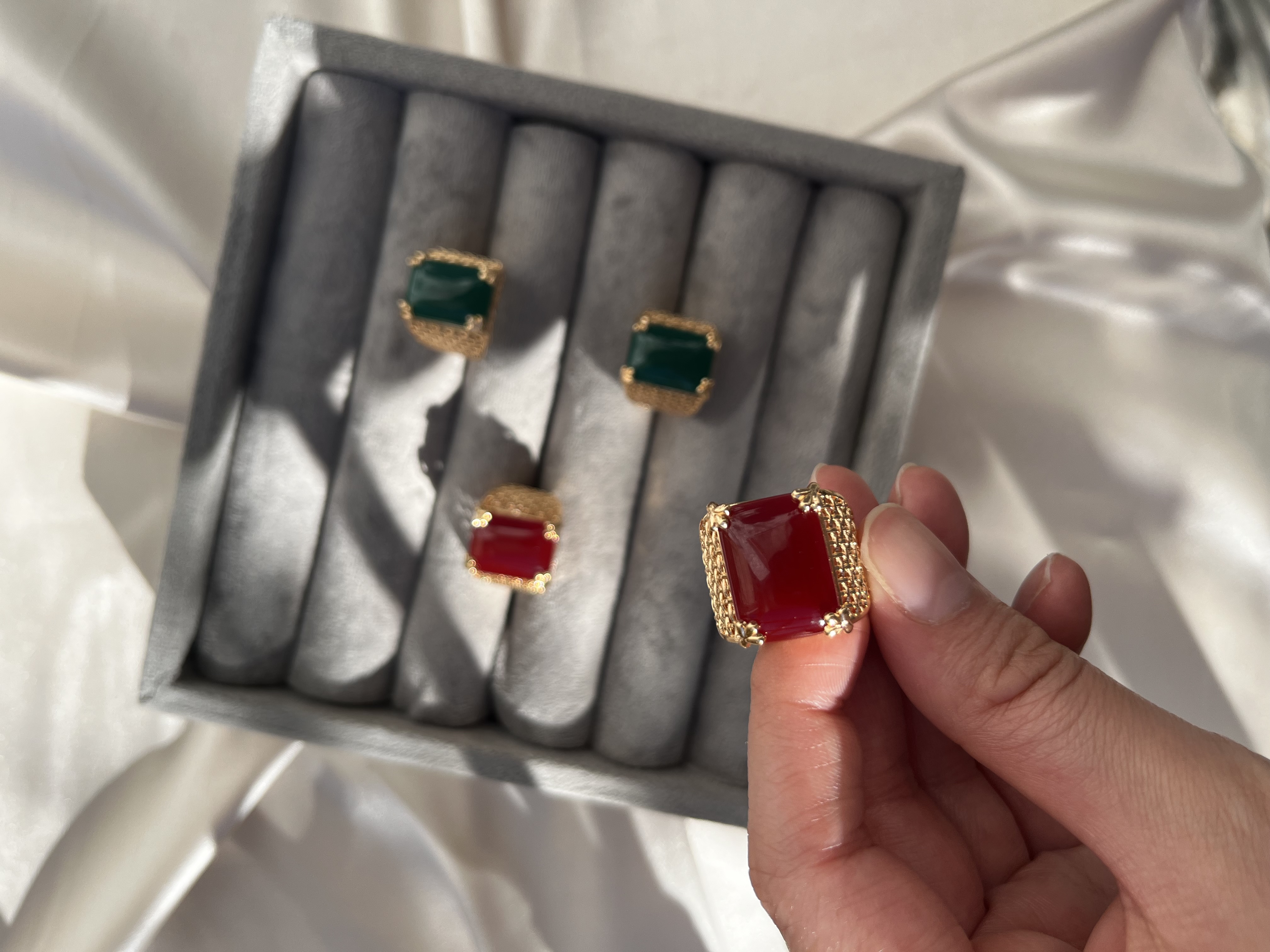 انگشتر زنانه طلاروس | برنج آبکاری رادیوم | نگین عقیق سبز و قرمز