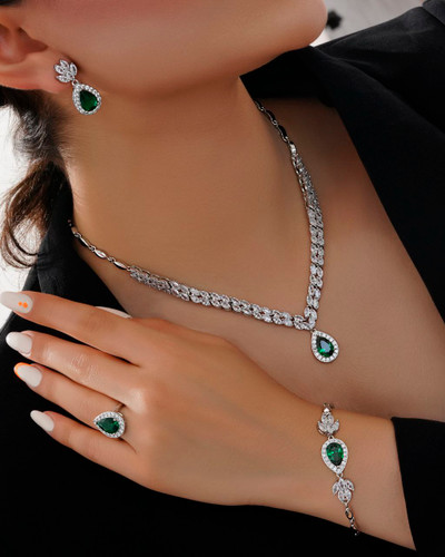 سرویس لوکس جواهری | فول نگین اشکی سبز | جنس برنج | آبکاری فوق العاده | کیفیت درجه ۱