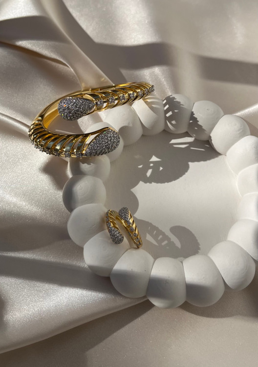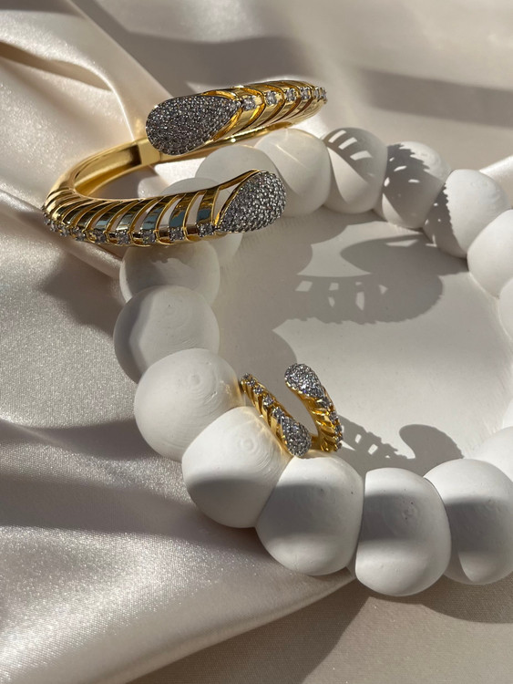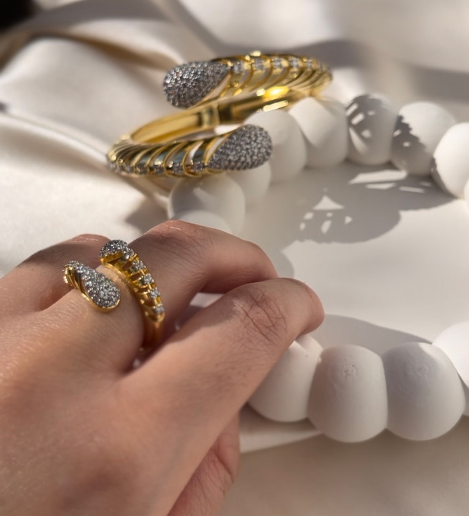 اگه دنبال یه درخشش لوکس و مشابه طلا هستی، این ست بنگل و انگشتر فولنگین همون انتخابیه که استایلت رو توی مهمانیها تکمیل میکنه!