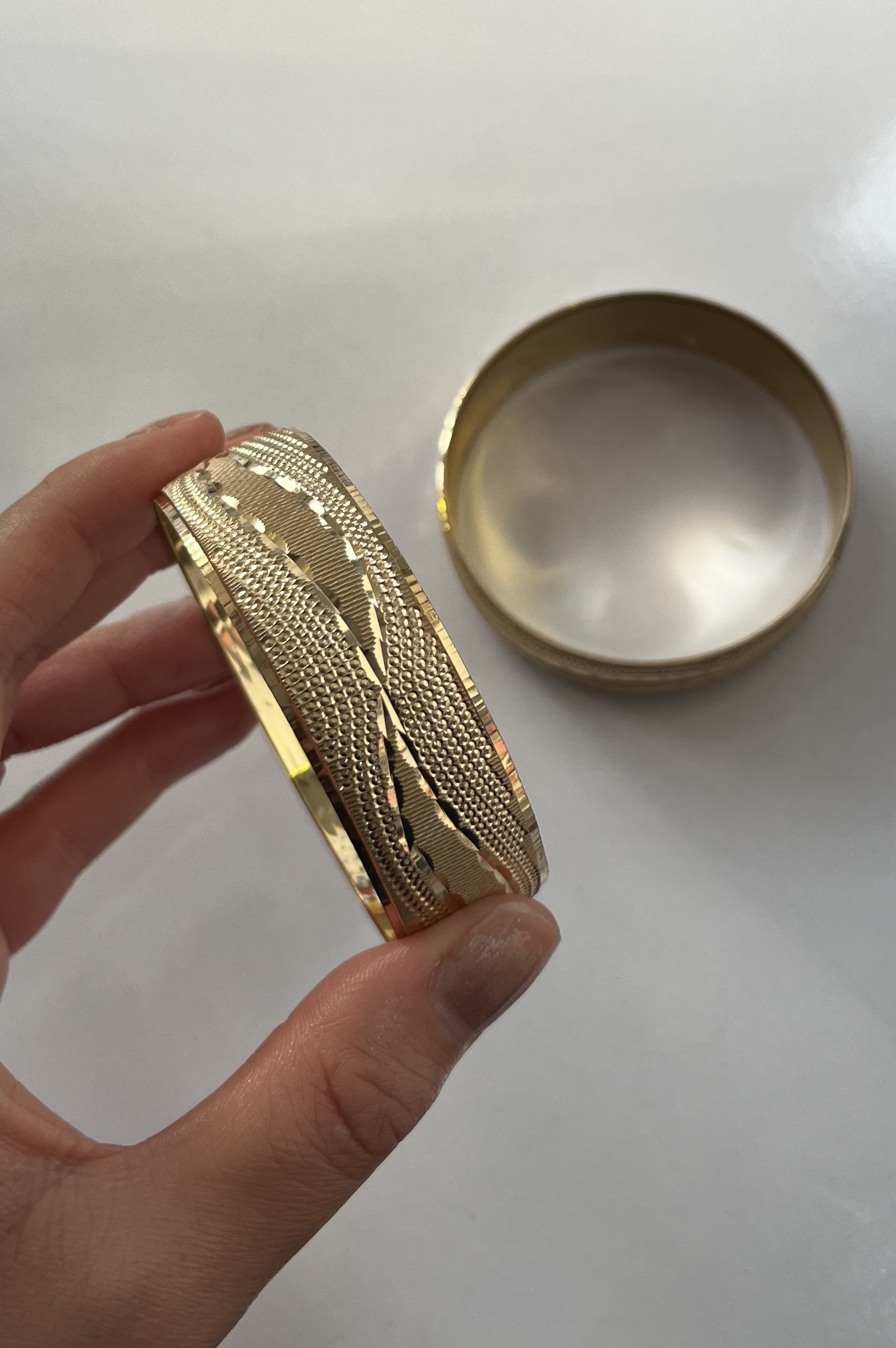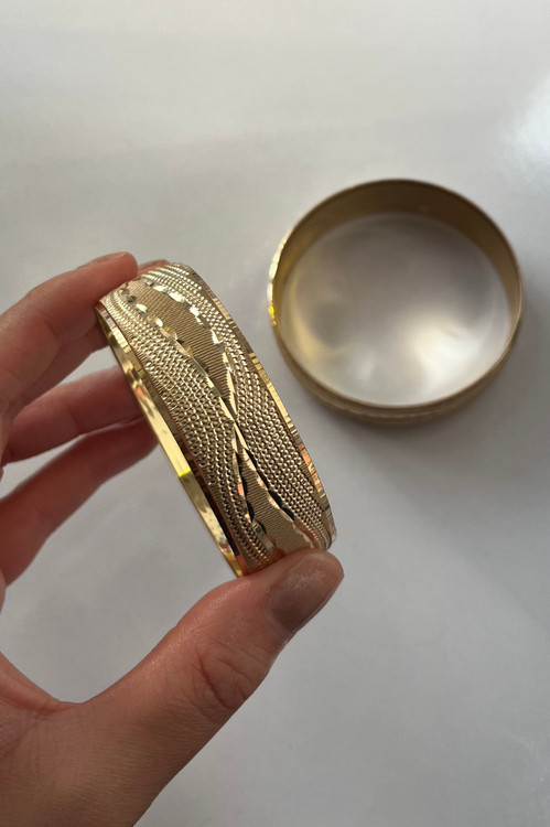 پهنای ۲۰ میل با اون تراشهای براقش حسابی روی دست میدرخشه و جلوه طلا رو برات چند برابر میکنه. کیفیت درجه ۱، رنگ ثابت با پوشش نانو و کاملاً ضدحساسیت، یعنی با خیال راحت هر روز استفاده کن بدون نگرانی از تغییر رنگ.