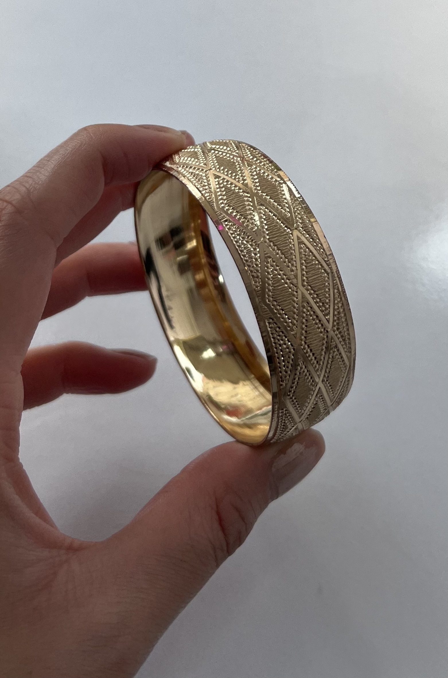 پهنای ۲۰ میل با اون تراشهای براقش حسابی روی دست میدرخشه و جلوه طلا رو برات چند برابر میکنه. کیفیت درجه ۱، رنگ ثابت با پوشش نانو و کاملاً ضدحساسیت، یعنی با خیال راحت هر روز استفاده کن بدون نگرانی از تغییر رنگ.