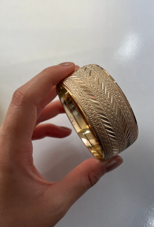 پهنای ۳۰ میل با اون تراشهای براقش حسابی روی دست میدرخشه و جلوه طلا رو برات چند برابر میکنه. کیفیت درجه ۱، رنگ ثابت با پوشش نانو و کاملاً ضدحساسیت، یعنی با خیال راحت هر روز استفاده کن بدون نگرانی از تغییر رنگ.