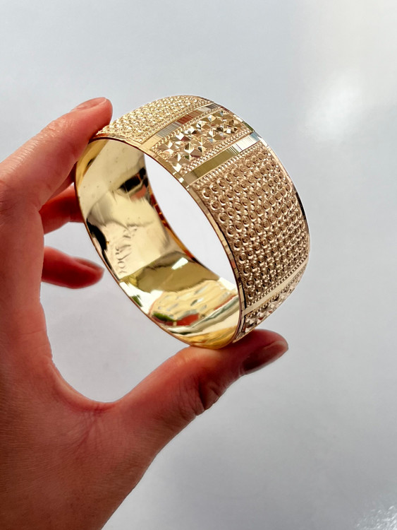 پهنای ۳۰ میل با اون تراشهای براقش حسابی روی دست میدرخشه و جلوه طلا رو برات چند برابر میکنه. کیفیت درجه ۱، رنگ ثابت با پوشش نانو و کاملاً ضدحساسیت، یعنی با خیال راحت هر روز استفاده کن بدون نگرانی از تغییر رنگ.