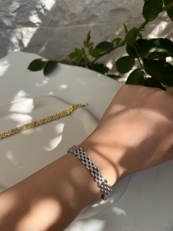 این دستبند لوکس مجلسی فول نگین برنج با آبکاری رادیوم باکیفیت همون چیزیه که لازم داری.
