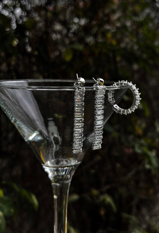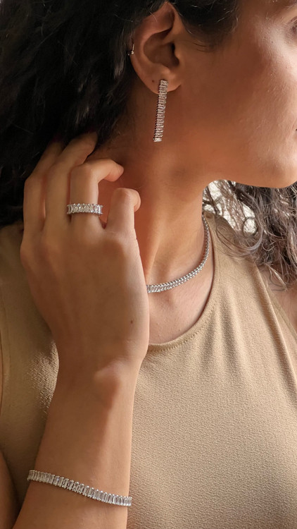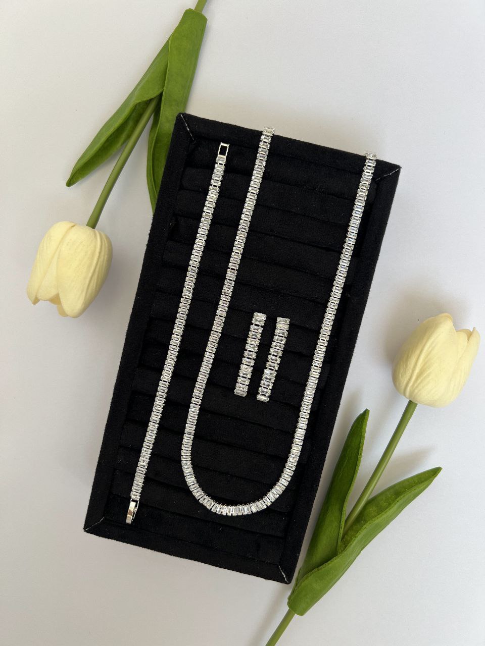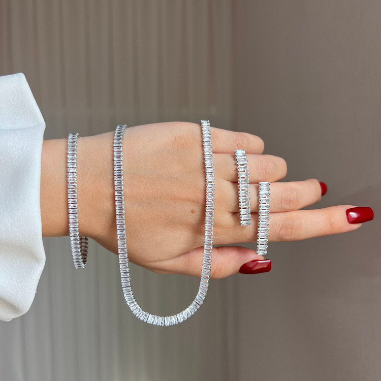 این ست شامل گردنبند، دستبند و انگشتر و گوشواره با نگینهای باگت سفیده که خیلی تمیز کار شده. جنسش از برنجه و با آبکاری رادیوم پوشونده شده تا براقیتش رو حفظ کنه.