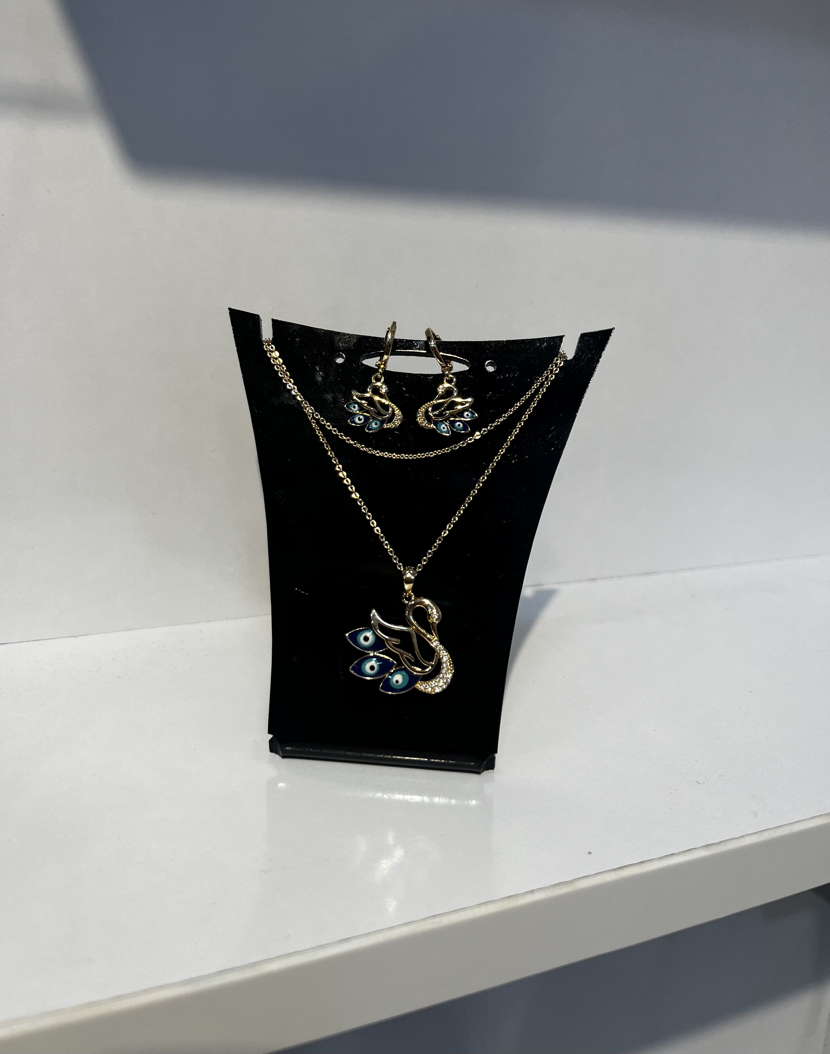 این نیم ست جنسش از برنجه و با آبکاری رادیوم پوشونده شده تا براقیتش رو حفظ کنه. زنجیرش هم استیل رنگ ثابته.