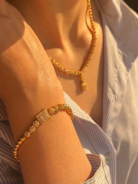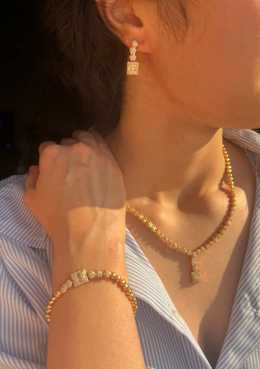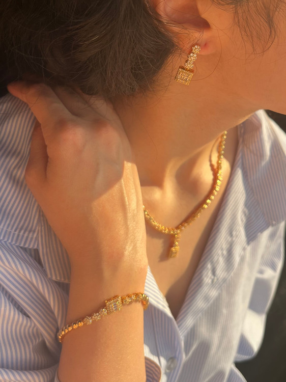 این سرویس جواهری فول نگین طلایی شامل گردنبند، گوشواره و دستبنده که با طراحی جذابش توی مهمانیها و مجالس حسابی میدرخشه.